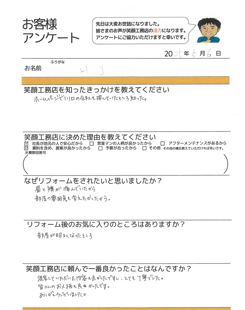 笑顔工務店にお願いしようと思ったのは、社長が地元の人で安心でした。また資料も含め提案が良かったからです。